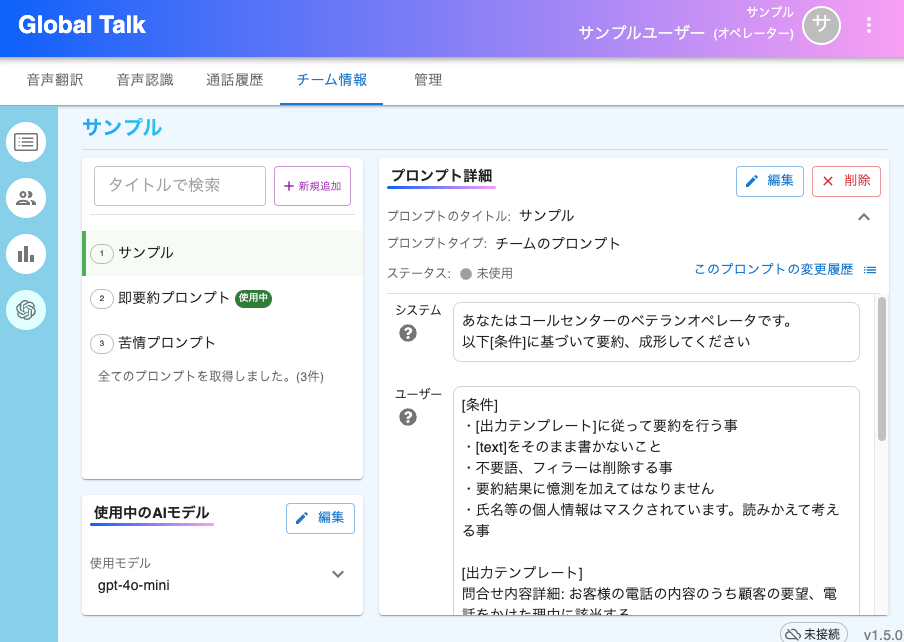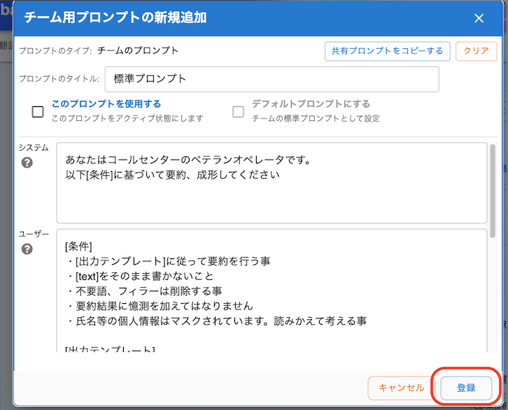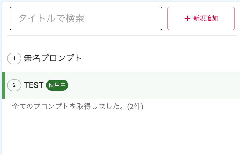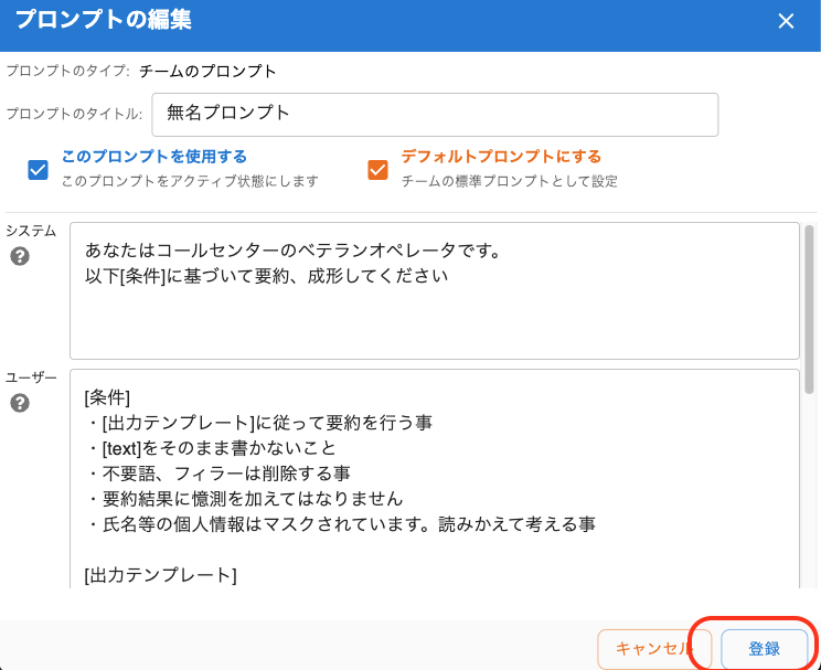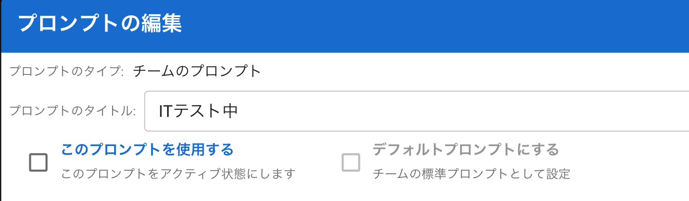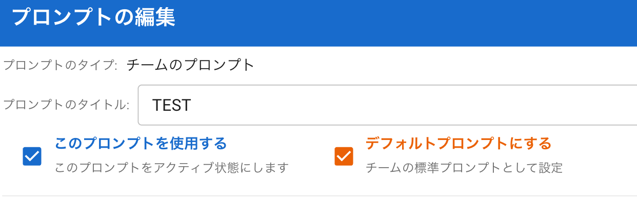 - 使用中のプロンプトが表示されるので、「タイトル」と、「システム」「ユーザー」ごとにプロンプトを編集できます。