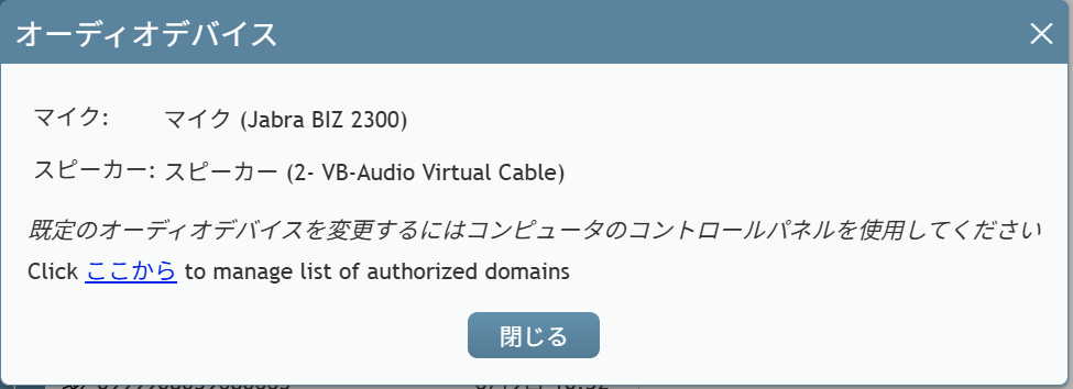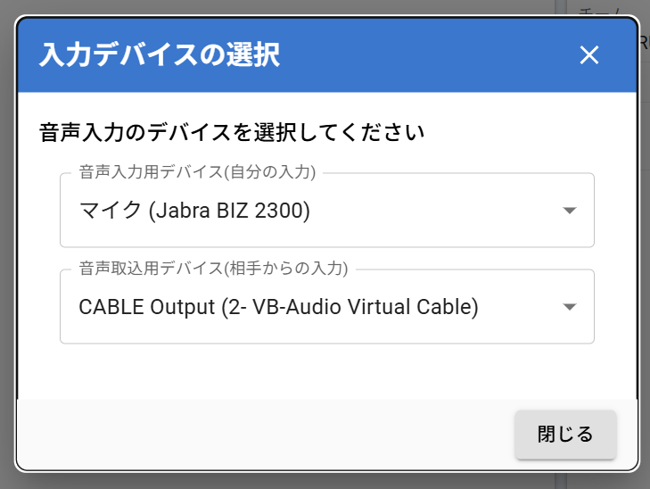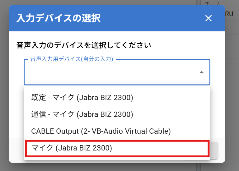 - 「音声入力用デバイス(自分の入力)」でヘッドセットを選択(今回の場合は マイク(Jabra BIZ 2300))