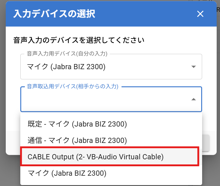 - 「音声取り込み用デバイス(相手からの入力)」で「*(VB-Audio Virtual Cable)」を選択