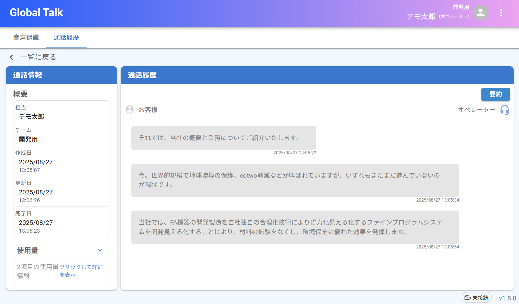 - 通話詳細画面右上の 要約 ボタンをクリック