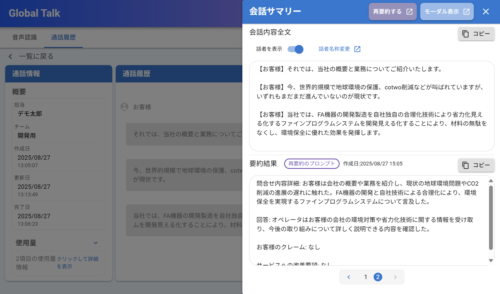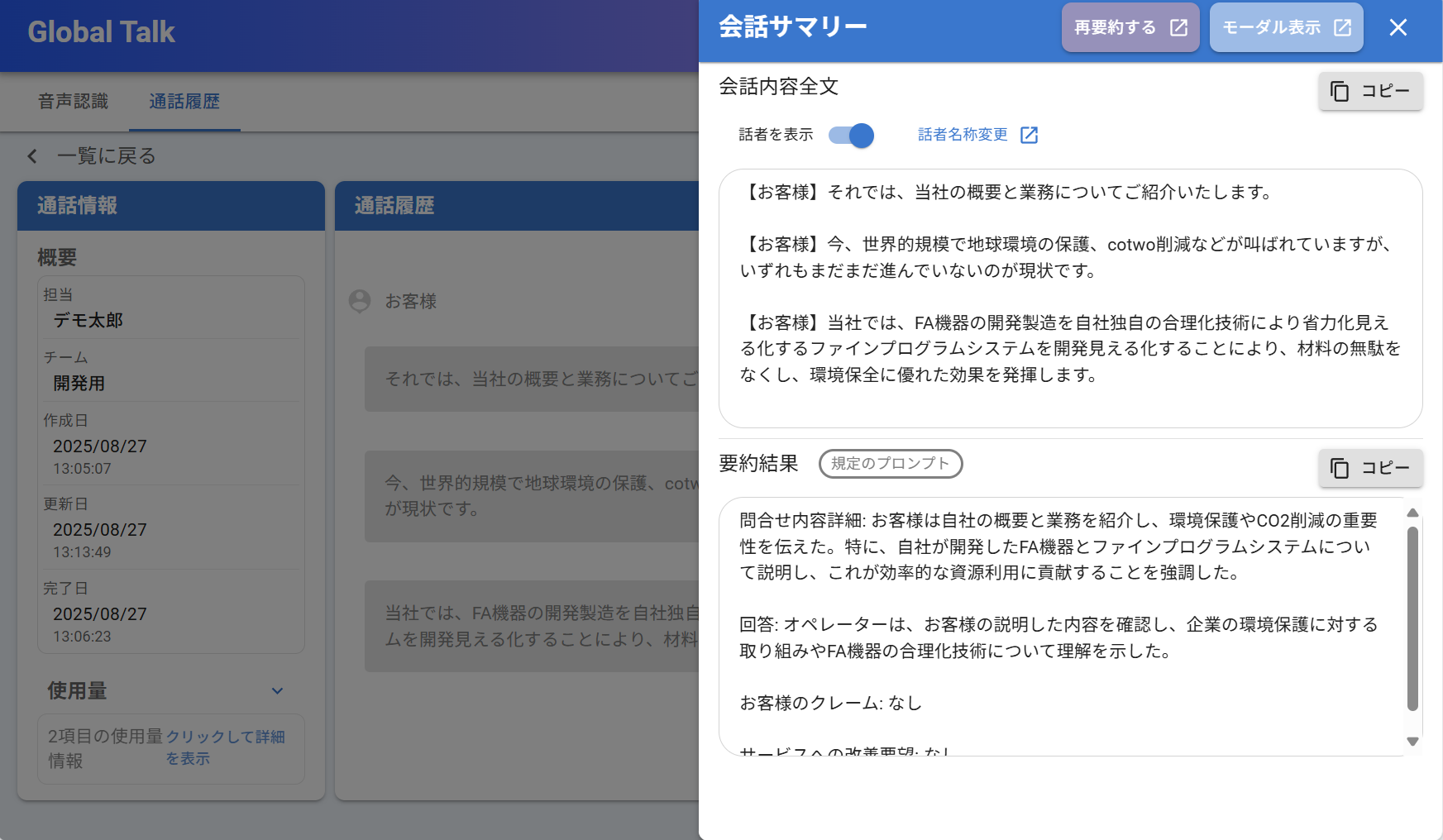 GlobalTalk の通話履歴から、自動的に要約結果を生成・再生成する手順をご紹介します。