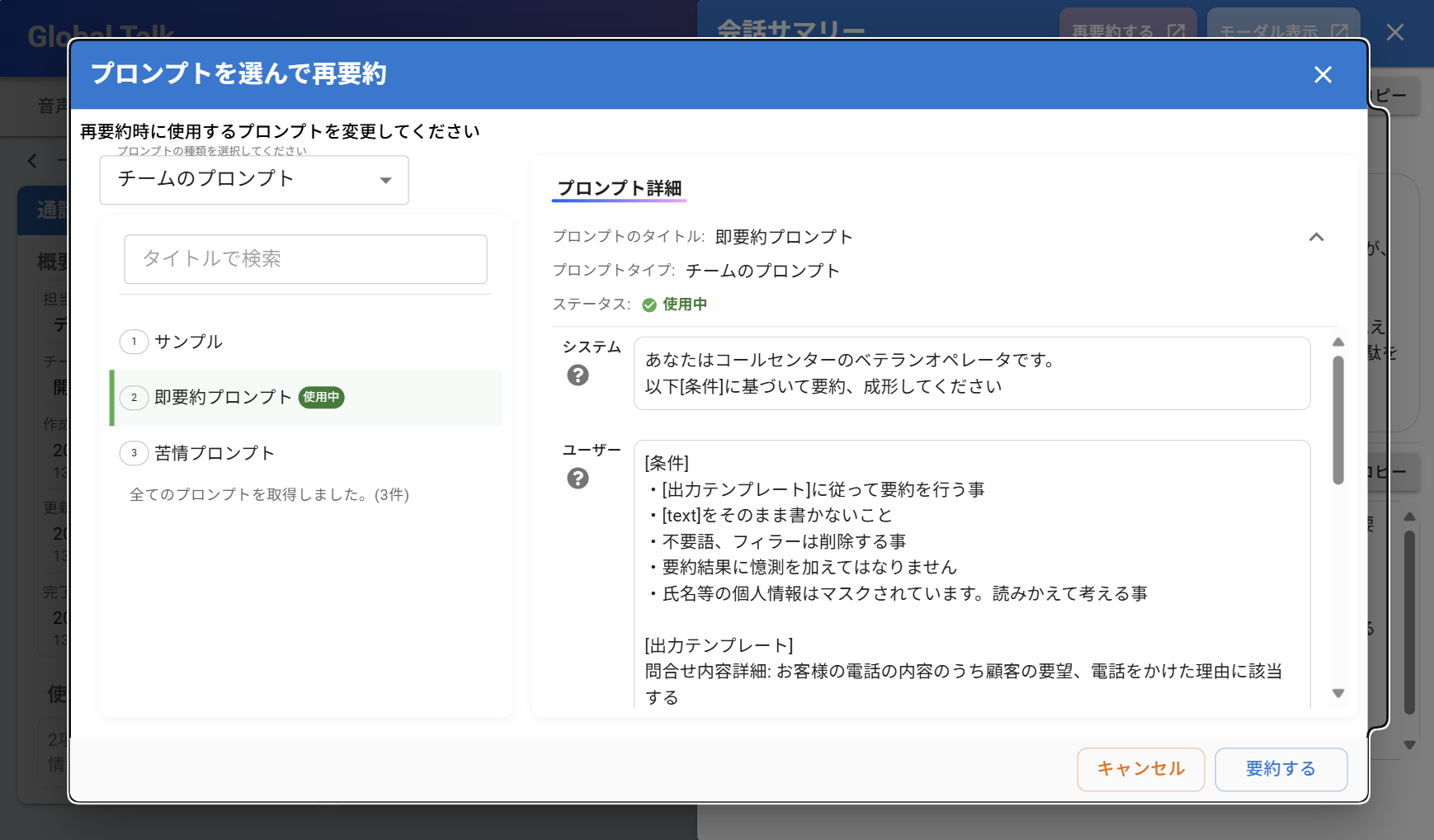通話履歴に登録された発話ログをもとに、要約結果を AI が自動生成します。 - プロンプト切替