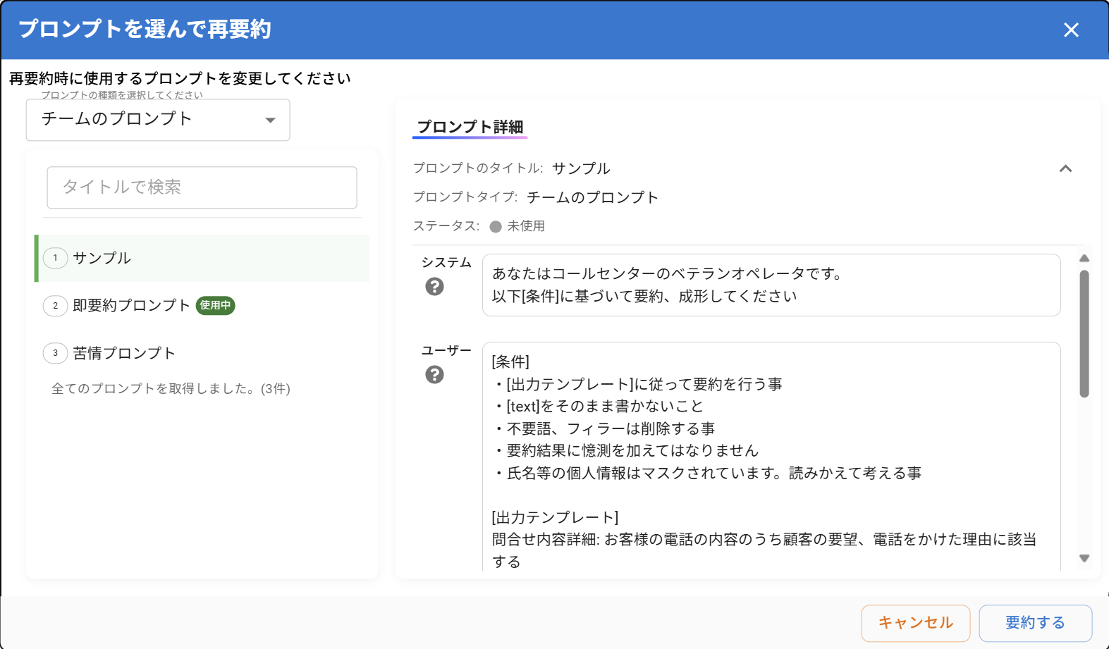 チーム共通/チーム専用/個人用など、用途に応じたプロンプトで再要約が可能です。 - 再要約