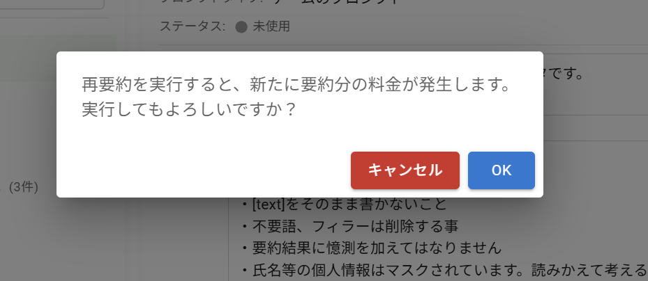 - 再要約には別途課金が発生します。実行前に表示される確認ダイアログをご確認ください。
