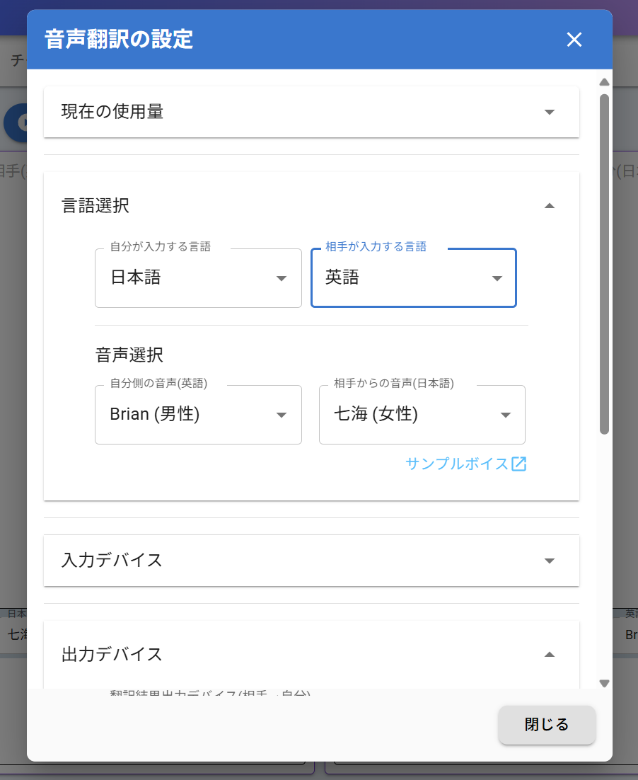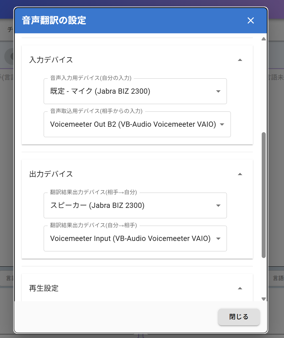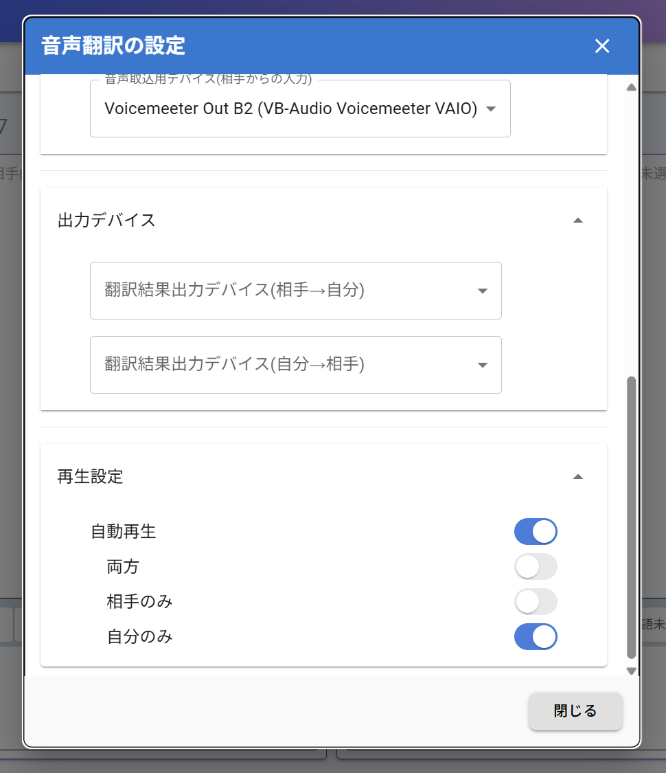 - 翻訳音声の出力デバイスも「自分用」「相手用」それぞれ指定できます。